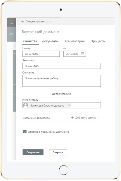 Современный интерфейс Microsoft SharePoint поддерживает адаптивный интерфейс и позволяет работать в системе на разных типах устройства. К примеру, пользователи могут согласовывать документы, добавлять комментарии, создавать поручения при помощи телефона или планшета.