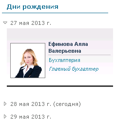 Модуль отображает именинников компании. Отображаются сотрудники, у которых день рождения сегодня, прошел несколько дней назад или предстоит через несколько дней.