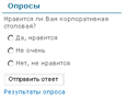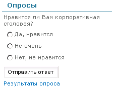 Модуль позволяет отображать на главной странице портала опросы. Для участия в опросе не требуется переход на другие страницы, для ответа на вопрос достаточно выбрать нужный ответ и нажать кнопку "Отправить ответ". Также в модуле предусмотрена ссылка для перехода на страницу с результатами текущего опроса.