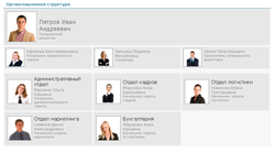 Узел "ОргСтруктура" отображает организационную структуру компании. Главная страница отображает руководителя компании, его непосредственных подчинённых и руководителей подразделений компании.